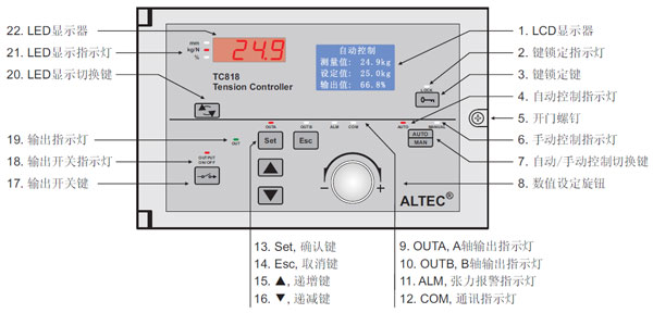 當控制器工作在自動控制模式時,自動控制指示燈(AUTO)點亮,可旋轉數值設定旋鈕或按遞增鍵/遞減鍵修改張力設定值,按AUTO/MAN鍵可切換到手動控制模式。