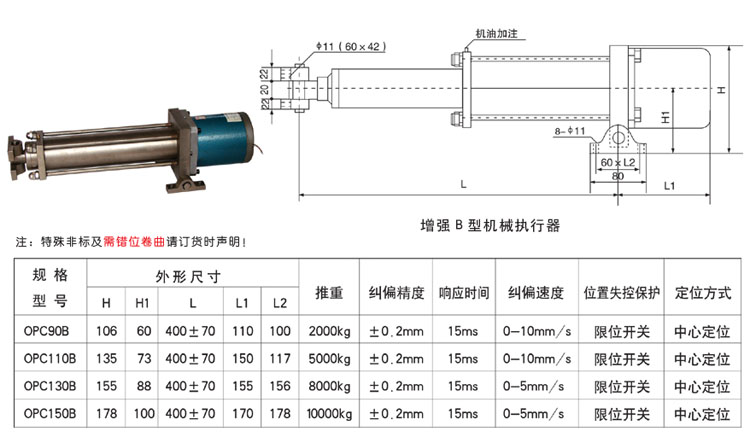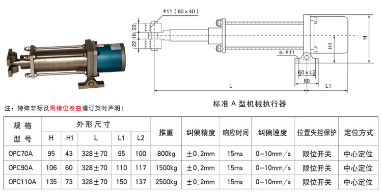 OPC-AB型光電糾偏系統由檢測單元(光電開關),控制單元(微電腦糾偏控制器)、執行單元(步進電機+滾珠絲杠)三大單元組成。光電糾偏系統結構簡單,精度高,免維護。